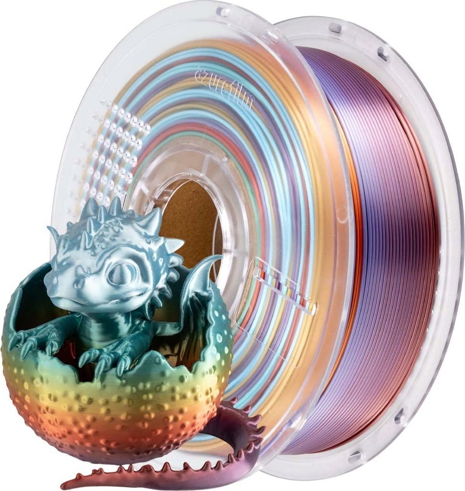 Das PLA Silk von AzureFilm ist ein leicht zu druckendes Seidenfilament, das mit samtiger Optik und einem glänzenden Finish außergewöhnliche Farbeffekte zum Vorschein bringt. Mit den üblichen PLA-Eigenschaften und einer tollen Ausstrahlung eignet sich das Material für den Druck von dekorativen Elementen wie Vasen, Figuren, Accessoires oder Haushaltsgeräten.