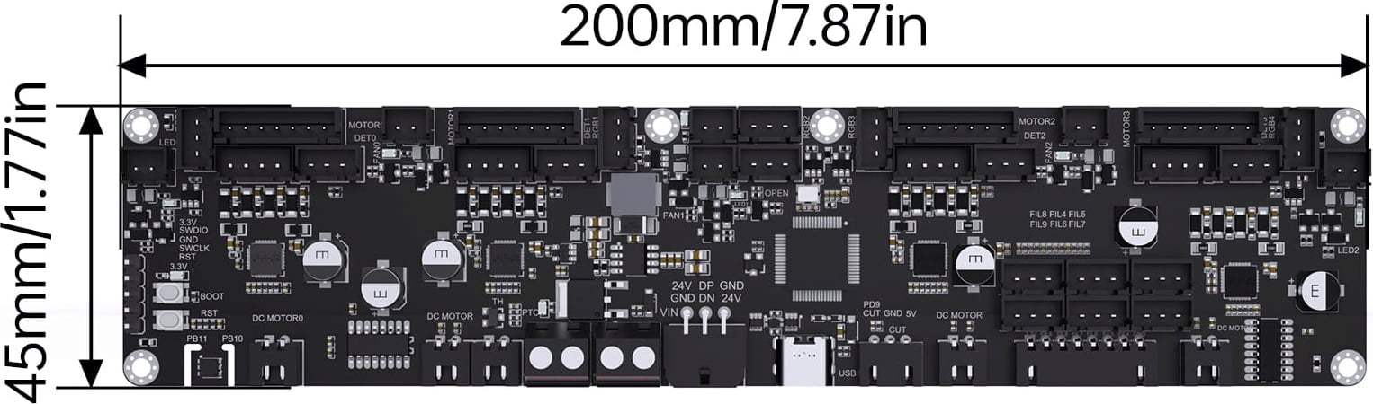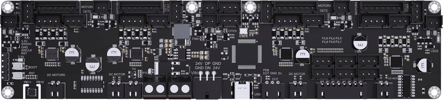 ► vier TMC2209 Treiber an Bord: Ultra-leichter, leiser Lauf deiner Motoren mit stabiler Drehmomentregelung. Das sorgt für reibungslose Shuttle-Bewegungen und saubere Filamentwechsel.