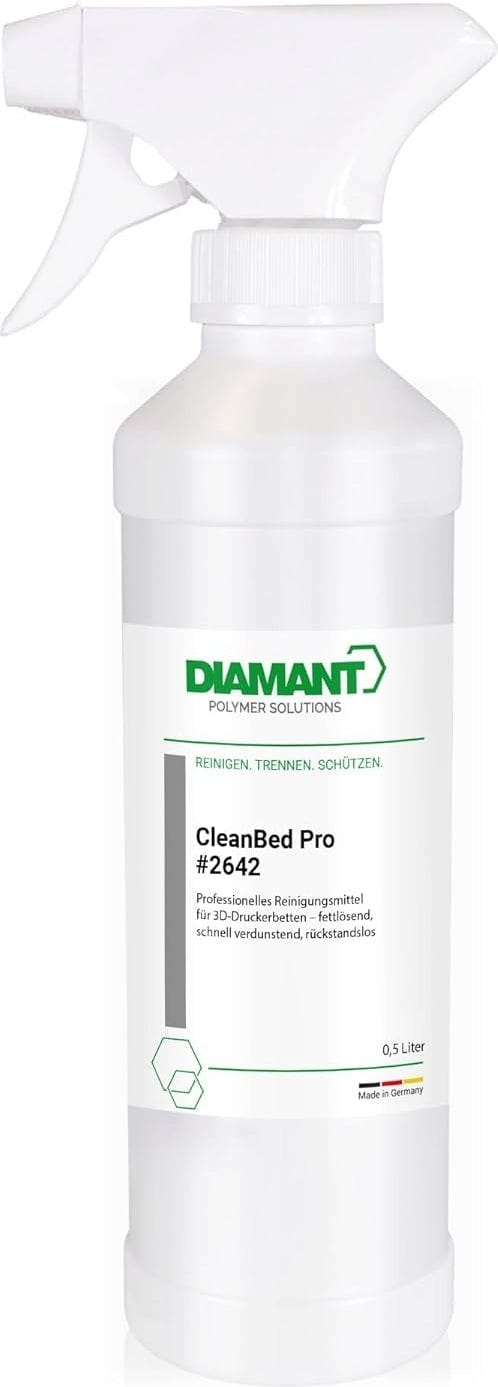 Diamant Polymer CleanBed Pro ist die zuverlässige Lösung zur Reinigung von 3D-Druckbettflächen. Mit seiner hochreinen Isopropanol-Formel (99 %) entfernt es effektiv Klebereste, Staub, Hautfett und andere Rückstände – und das völlig ohne aggressive Zusätze, Duftstoffe oder Wasser. Das Ergebnis: eine absolut saubere Oberfläche, die für eine optimale Haftung während des Drucks sorgt!