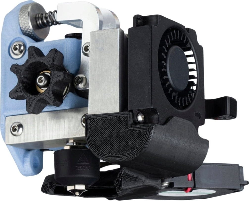 Seitlich des Kühlblocks wurden Kühlrippen platziert, mit dem Ziel, den Filamentweg so kurz wie möglich zu gestalten. Dieser verkürzte Filamentweg sorgt dafür, dass der Extruder schneller und präziser reagiert und es nicht zum Knicken kommt. Die scharfen Zähne der beiden Antriebsräder greifen das Filament besonders fest von beiden Seiten, wodurch dieses nicht nur geschmeidig, sondern auch gleichmäßig in das Hotend geschoben wird.